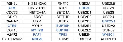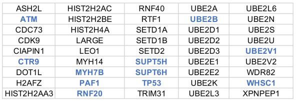 Figure S2: List of 45 genes identified in the RNF20 interactome generated via STRING. Genes with de-novo mutations in patients with CHD are highlighted in blue.