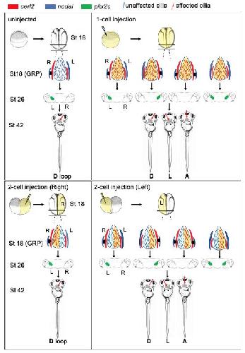 Normal cilia are shown in blue, cilia affected by MO injection are shown in red. Domains of cerl2 (coco, dand5) expression are shown in red, and nodal expression is shown in blue. pitx2c expression is shown in green.