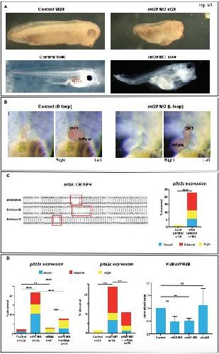 (C) Left panel: CRISPR mutagenesis of rnf20 in Xenopus, sequencing of three clones from a single mutant embryo showing 2bp, 3bp and 7bp deletions. Right panel: pitx2c expression in rnf20 gRNA and Cas9 protein or Cas9 alone injected embryos. n=total number of embryos from 3 independent experiments. Chi-square/Fisherâs Exact Test, **** p<0.00005.