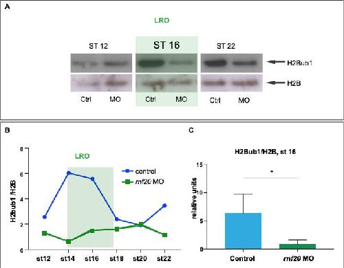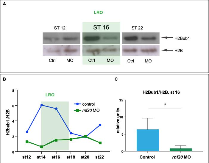 (C) Quantification of western blot H2Bub1/H2B ratio in control MO (blue) and rnf20 MO (green) injected embryos at stages corresponding to LRO formation. 3 independent experiments, unpaired t test, * p<0.05.