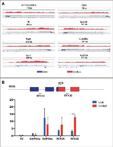 (B) ChIP-qPCR of mouse oviducts and liver with anti-H2Bub1 antibody. qPCR primers: NC (non-specific primers), GAPDHp (negative control), GAPDHc (positive control), RFX3A and RFX3B are RFX3 specific primers; blue boxes are 5'UTR, red boxes are the coding region. Chip qPCR was performed in ciliated (oviducts-red) and nonciliated (liver-blue) tissues from Rnf20+/+ and Rnf20+/- mice. Results are from 4 independent experiments, unpaired T-test, ***p<0.0005.