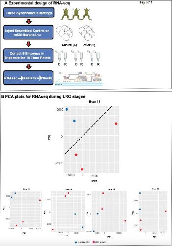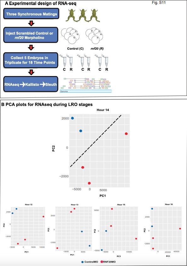 (B) PCA plot of RNAseq experiment at hours 12, 13, 14, 15, 16 for two control replicates (blue circles) and three rnf20MO replicates (red circles).