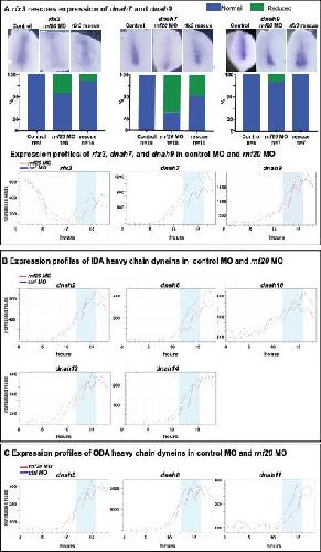 (C) Expression profiles of outer dynein arm heavy chains (ODAs) in rnf20 MO and