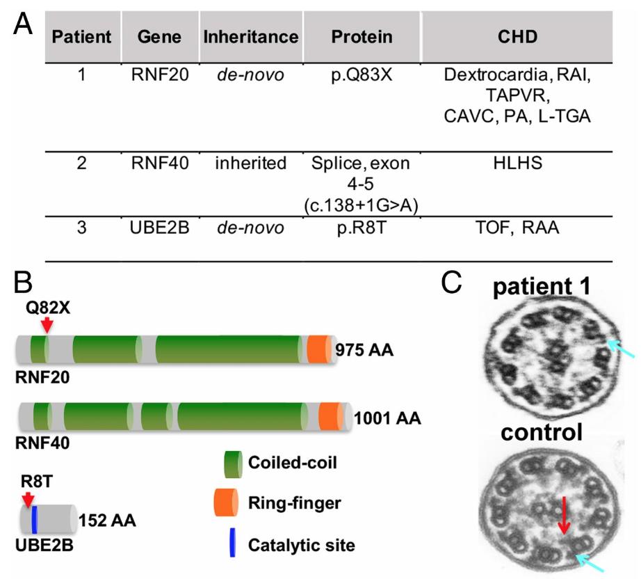 Figure 1. Mutations affecting the core RNF20 complex are identified in patients with congenital heart disease. (A) Summary of patient variants, inheritance, and phenotypes affecting the core components of the RNF20 complex (RNF20, RNF40, and UBE2B). CAVC, complete atrioventricular canal; HLHS, hypoplastic left heart syndrome; L-TGA, levo-transposition of the great arteries; PA, pulmonary atresia; RAA, right aortic arch; RAI, right atrial isomerism; TAPVR, total anomalous pulmonary venous return; TOF, tetralogy of Fallot. (B) Diagrams of RNF20, RNF40, and UBE2B with patient variants (red arrows) indicated. (C) TEM of tracheal cilia from a patient with the RNF20 variant (Top) and control (Bottom). Blue arrows point to outer dynein arms; the red arrow points to IDAs. High-magnification electron micrographs were obtained from greater than 10 ciliated cells.