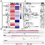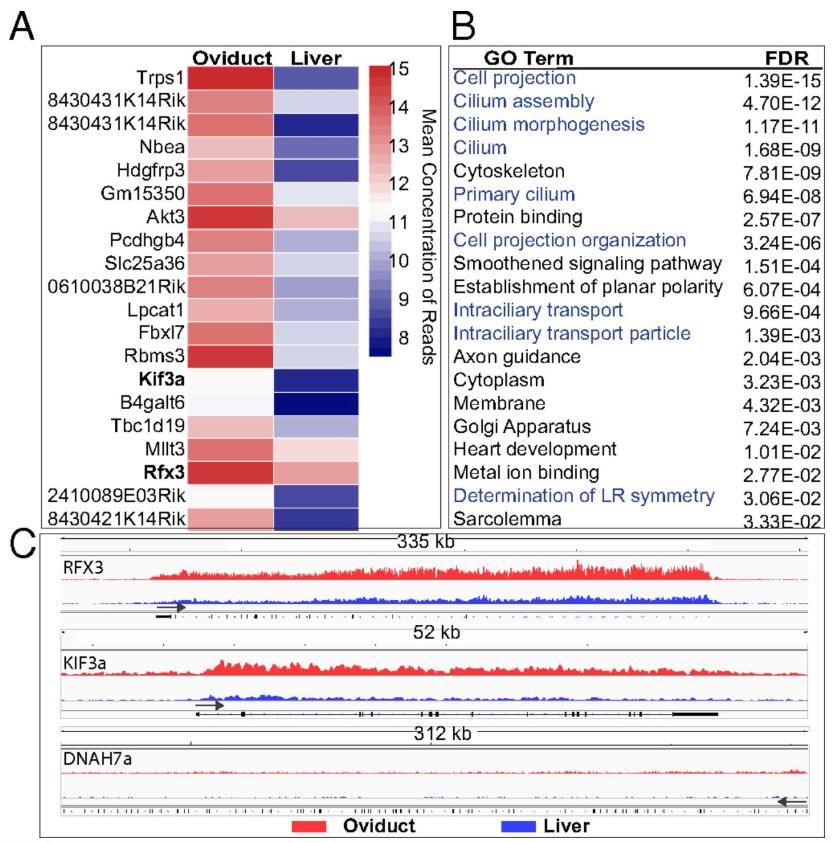 Figure 4. H2Bub1 marks are enriched at cilia genes in multiciliated tissue. (A) A heatmap depicting the top 20 significant regions with increased H2Bub1 occupancy in multiciliated tissue compared with nonciliated tissue. The bolded genes are cilia-related genes depicted in C. (B) The top 20 significant gene ontology terms from the regions that have increased H2Bub1 occupancy in multiciliated tissue compared with nonciliated tissues. The cilia-related gene ontology terms are shown in blue. (C) The H2Bub1 binding profile, depicted using fold enrichment against random distribution values ranging from 0 to 10, across the Rfx3, Kif3a, and Dnah7 genes in multiciliated tissue (oviduct; red) and nonciliated tissue (liver; blue). The arrows indicate the TSS and the direction of transcription.