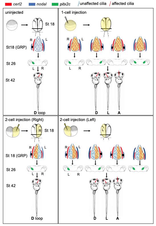 Figure S3: Schematic of one cell and one cell in two-cell embryo Xenopus injections and predicted effect on asymmetrically expressed mRNA markers and heart looping. Early embryos are visualized from the dorsal aspect. The LRO is visualized from the ventral aspect. Pitx2cstage embryos are shown as a composite of the left and right sides. Tadpoles are shown from the ventral aspect.