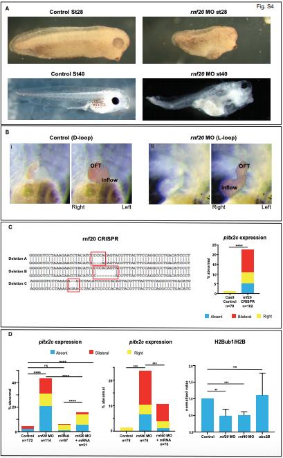 Figure S4: (A) Images of rnf20 MO injected and control embryos at stages 28 and 40. Embryos were injected at the 1-cell stage, the rnf20 MO embryos shown are the most severe end of the spectrum of phenotypes.