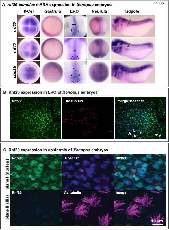 Figure S5: (A) In situ hybridization images with rnf20, rnf40 and ube2b specific probes in X.tropicalis during important stages of development. 8-cell, gastrula (stage 10), LRO formation (GRP, stage 16), neurula (stage 18), and early tadpole (stage 24). LRO is outlined at stage 16, and arrows indicate the developing kidney in the tadpole stage images. Representative examples of 3 independent experiments.