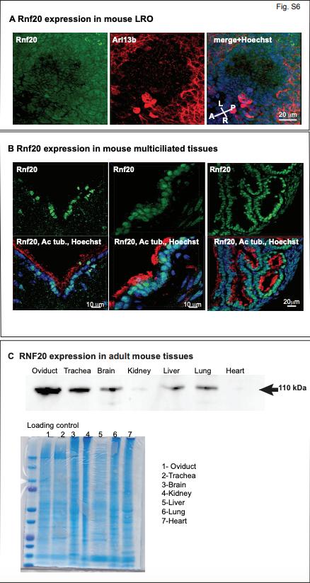 Figure S6: (A) Rnf20 expression in the mouse LRO. The LRO structure was identified by presence of monociliated cells labeled with anti-Arl13b, nuclei were visualized by Hoechst staining. Anterior (A)-Posterior (P) and Left (L)-Right (R) axes are indicated. The image is the maximum intensity projection of a Z stack encompassing the entire LRO.