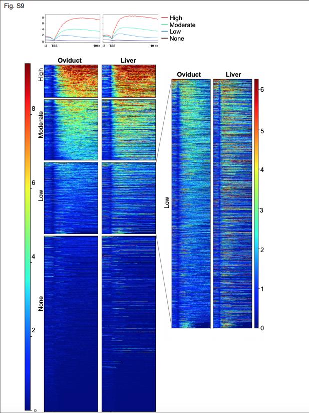 H2B ubiquitination surrounding the transcription start site (TSS) (-1Kb, + 10Kb) in ciliated tissue (oviduct) and non-ciliated tissue (liver). Genes are grouped by H2Bub1 levels into four clusters: high, moderate, low, and none. The average profile, depicted using fold enrichment against random distribution values, across this region for each cluster in each tissue is shown above the heatmap. A zoomed in heatmap of the "low" cluster highlights the differences between the ciliated and non-ciliated tissues.