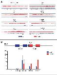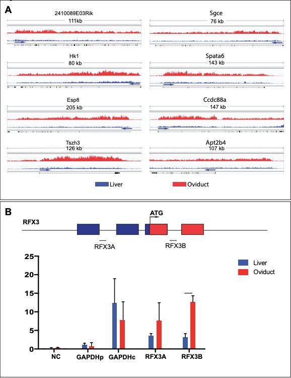distribution values ranging from 0 to 10, across the eight most significant cilia genes based on enrichment of H2Bub1 occupancy in ciliated tissue (oviduct, shown in red) compared to non-ciliated tissue (liver, shown in blue) according to Chip-seq. The arrows indicate the transcription start site.