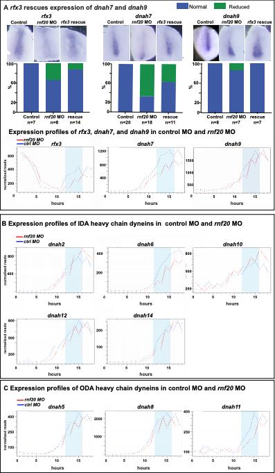 Figure S12: (A) Upper panel: Expression of rfx3, dnah7, and dnah9 by in situ hybridization in control, rnf20 MO injected, and rnf20 MO and rfx3 mRNA co-injected Xenopus embryos. LROs are shown. Central panel: quantification of the in situ experiment. Blue-% of embryos with normal expression, green-% of embryos with decreased expression. Lower panel(A), (B), and (C): RNA seq data comparing expression profiles in scrambled MO injected control embryos (blue) and rnf20 MO injected embryos (red) at 0-18 hourspost fertilization. The area highlighted in blue corresponds to the time of LRO formation and function.