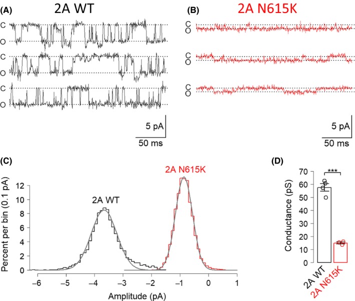 Figure 3. GluN2AN615K reduces single‐channel conductance. A and B, Representative voltage‐clamp recordings made from outside‐out patches from oocytes expressing GluN2AWT or GluN2AN615K –containing NMDA receptors in the presence of glutamate (30 μmol/L) and glycine (30 μmol/L). “C” = closed, “O” = open. Holding potential −60 mV. C, Representative amplitude histograms showing fitted normal distributions, superimposed from two different patches held at –60 mV. The means of the fitted distributions/holding potential were used to calculate conductance. D, Summary data showing conductance, calculated as current amplitude/holding potential. A t‐test showed a reduction in conductance in oocytes expressing GluN2AWT (58 ± 3 pS (n = 4), total events = 2555) and GluN2AN615K (15 ± 1 pS (n = 3), total events = 774, t