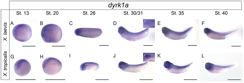 Figure 2. In situ hybridization of dyrk1a across developmental stages demonstrates kidney expression in X. laevis and X. tropicalis.To demonstrate spatial-temporal expression of dyrk1a in the kidney, in situ hybridization was performed. Given that the RNA probe was designed against the X. tropicalis sequence, both species were analyzed. Pronephric kidney development occurs between stages 12.5-40. Expression of dyrk1a can be visualized in stage 31-40 embryos suggesting Dyrk1a may be important for kidney development. For clarity, insets (Dâ and Jâ) for stage 30/31 tadpole kidneys with 200μm scale bars have been added. All other scale bars represent 1000μm.