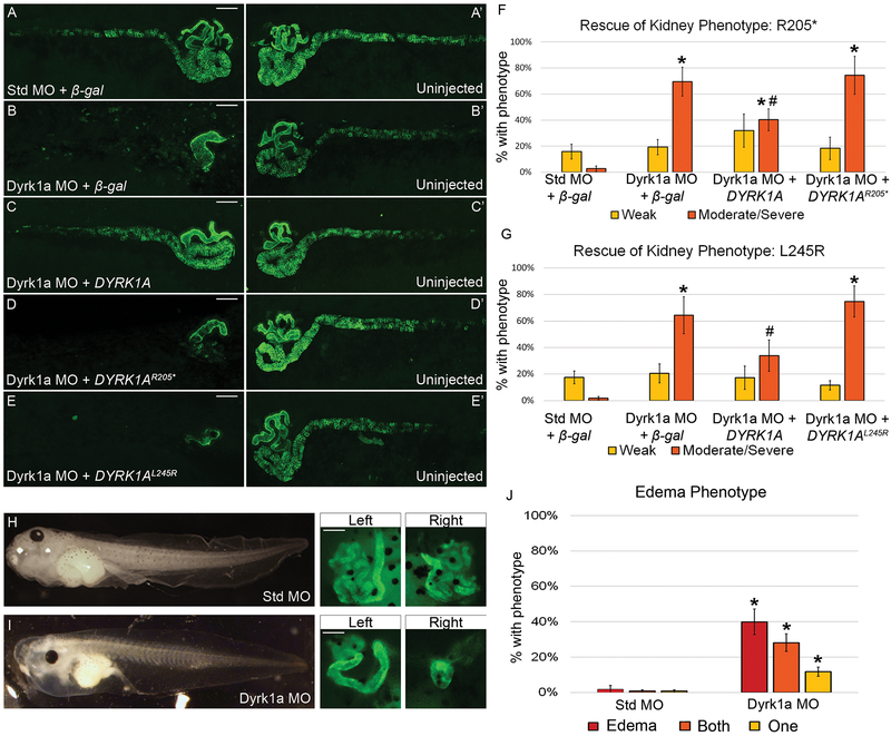 Figure 3. Loss of Dyrk1a affects kidney development in Xenopus laevis.(A-Eâ) Embryos were unilaterally injected at the 8-cell stage with 10ng of Dyrk1a MO or Standard MO (Std MO) along with 50 pg β-gal, wild-type, DYRK1AR205*, or DYRK1AL245R RNA. Stage 40 tadpoles were stained with kidney antibodies 3G8, which label the proximal tubules and 4A6, which labels the distal and connecting tubules. Letters without apostrophes (A-E) represent the injected side, whereas letters with apostrophes (Aâ-Eâ) represent the uninjected side. (B) Knockdown with a translation-blocking Dyrk1a MO disrupts kidney development which can be partially rescued (C) by co-injecting with wild-type human DYRK1A RNA but not (D-E) DYRK1AR205* or DYRK1AL245R RNA. (A) Co-injection of a Standard MO and β-gal serve as a negative control. Scale bars represent 100 μm. (F) The graph demonstrates a significant difference between embryos injected with either Dyrk1a MO + β-gal or Dyrk1a MO + DYRK1AR205* versus with Dyrk1a MO + DYRK1A suggesting successful rescue with human DYRK1A but not with the nonsense RNA. (G) The second graph demonstrates a significant difference between embryos injected with Dyrk1a MO + DYRK1AL245R versus with Dyrk1a MO + DYRK1A, which suggests that the missense RNA also fails to rescue. Significance was established against embryos that had a moderate or severe kidney phenotype (orange bar) and excluded embryos that had a weak phenotype (yellow bar). (F) * (asterisk) = p<0.001 comparing individual experimental groups to Standard MO + β-gal. # (pound sign) = p<0.006 comparing Dyrk1a MO + DYRK1A to Dyrk1a MO + DYRK1AR205*. (G) * (asterisk) = p<0.001 comparing Standard MO + β-gal to Dyrk1a MO + β-gal or Dyrk1a MO + DYRK1AL245R. # (pound sign) = p<0.05 comparing Dyrk1a MO + DYRK1A to Dyrk1a MO + DYRK1AL245R. For edema assays, embryos were injected at the 4-cell stage in both ventral cells to target both kidneys while avoiding the dorsal cells fated to become the heart and liver, which can also lead to edema. (H) Embryos injected with the Standard MO did not develop edema while embryos injected (I) with the Dyrk1a MO did develop edema and also suffered from abnormal kidney formation. (J) The graph demonstrates a significant difference in edema and kidney abnormalities in embryos injected with either Standard MO or Dyrk1a MO. * (asterisk) = p<0.008 comparing Standard MO to Dyrk1a MO embryos with edema, defects in one, and defects in both kidneys. Error bars represent standard error. For ease of comparison of (n) and p-values across conditions, please refer to Table S1-3.