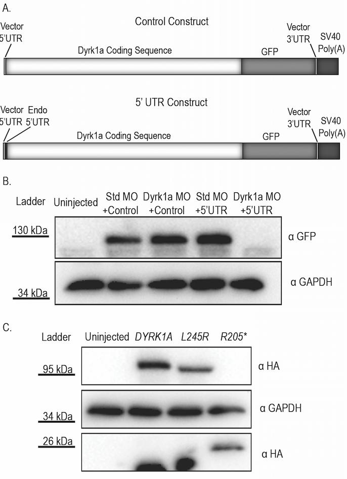 Supplementary Figure 2. The Dyrk1a MO correctly targets Xenopus dyrk1a RNA and wild-type, missense, and truncated human DYRK1A proteins are expressed in neurula stage Xenopus embryos. Two constructs were generated with a GFP tag to demonstrate that the MO targets the endogenous 5â untranslated region (UTR) of dyrk1aâs transcript. (A, bottom) Schematic demonstrates that the 5â UTR construct contains part of dyrk1aâs endogenous (endo) 5â UTR that is recognized by the Dyrk1a MO (A, top) while the control construct does not. (B) Single-cell embryos were injected with 10 ng of either Dyrk1a MO or Standard MO (Std MO) and co-injected with 1 ng RNA (either Xenopus dyrk1a control, or Xenopus dyrk1a + 5â UTR). Western blot demonstrates complete reduction of GFP protein levels, indicative of loss of exogenous Dyrk1a in neurula stage embryos injected with Dyrk1a MO and dyrk1a + 5â UTR RNA (lane 5) compared to the Standard MO and dyrk1a + 5â UTR (lane 4) and Standard MO or Dyrk1a MO and dyrk1a control RNA (lane 2, lane 3). GAPDH was used as a loading control. (C) Wild-type human DYRK1A cDNA was inserted into a pCS2-HA vector. DYRK1AR205* and DYRK1AL245R variants were generated from the wild-type human pCS2-HA-DYRK1A vector. Western blot demonstrates HA protein is present in wild-type, missense (lanes 2 and 3 ~95 kDa), and truncated DYRK1AR205* (lane 4 ~25 kDa) lanes, demonstrating Xenopus neurula stage embryos can successfully translate human DYRK1A RNA. GAPDH was used as a loading control. Bar under the molecular weight indicates its position on the blot.