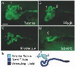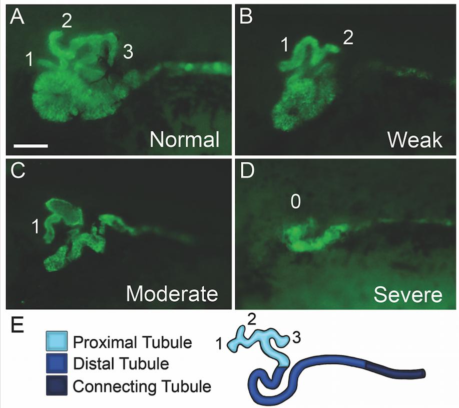 Supplementary Figure 4. Scoring system for Xenopus embryonic kidneys. Kidneys were scored at Nieuwkoop and Faber stage 40.12 (A) A normal kidney consists of three branches in the proximal region with a âtrunkâ connecting to the convoluted looping of the early distal region, and strong immunostaining of the late distal region. (B) A weak phenotype consists of loss of one of the branches in the proximal region and possibly less early distal looping and/or partial loss of late distal immunostaining. (C) A moderate phenotype consists of loss of two of the branches in the proximal region with moderate loss of early distal looping and possible loss of late distal immunostaining. (D) A severe phenotype consists of complete loss of proximal tubules with severe or complete loss of early distal looping and the late distal region. (E) The schematic represents a stereotypical Xenopus embryonic kidney with proximal tubules in light blue, distal tubules in blue, and connecting tubules in dark blue. Scale bar represents 100 µm.