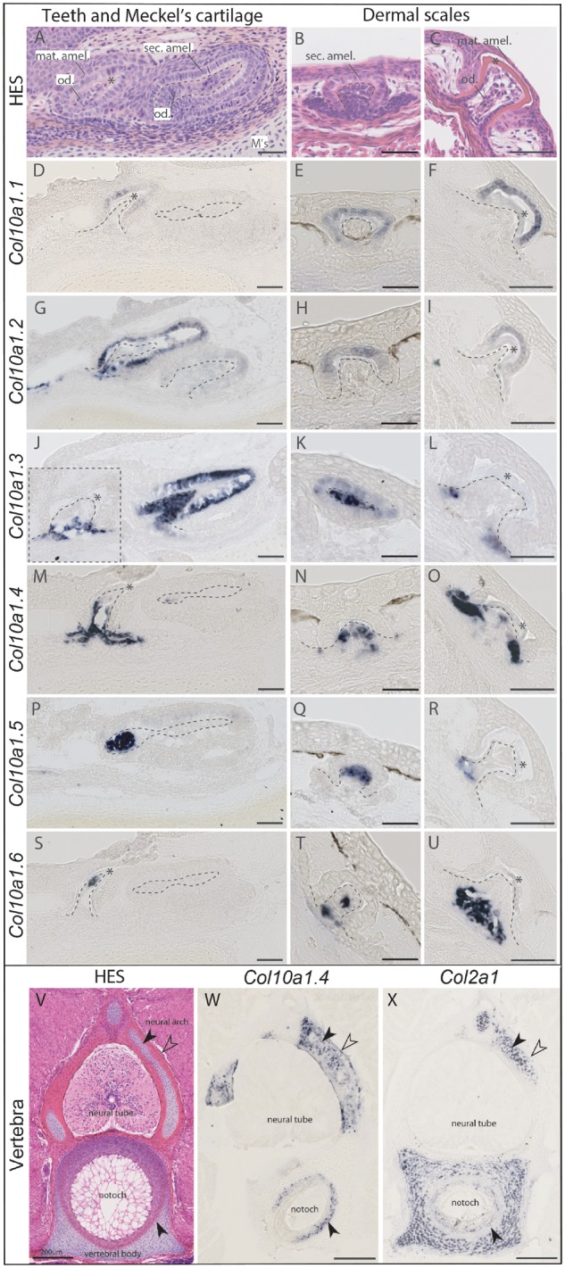 Fig. 3. Histology and in situ hybridization on cryosections of catshark Scyliorhinus canicula skeletal tissues at stage 33. (A, B, C, V) HematoxylinâEosinâSaffron (HES) histological staining. (DâU) Expression of Col10a1 duplicates in developing teeth and scales of catshark detected with probes specific for each duplicate. Dotted lines indicate the mesenchymal compartment limits. Asterisk marks the mineralizing matrix, often seen as empty space due to decalcification. (W, X) Expression of Col10a1.4 duplicate in comparison to Col2a1 in mineralizing vertebral tissues of catshark. Black arrowhead in the neural arch points to the site of globular mineralization; open arrowhead points to the site of lamellar mineralization; black arrowhead in the vertebral body points to the site of fibrous mineralization. Scale bars: 50âµm (AâU), 200âµm (VâX). Abbreviations: mat. amel., maturation stage ameloblasts; Mâs, Meckelâs cartilage; notoch, notochord; od., odontoblasts; sec. amel., secretory ameloblasts.