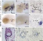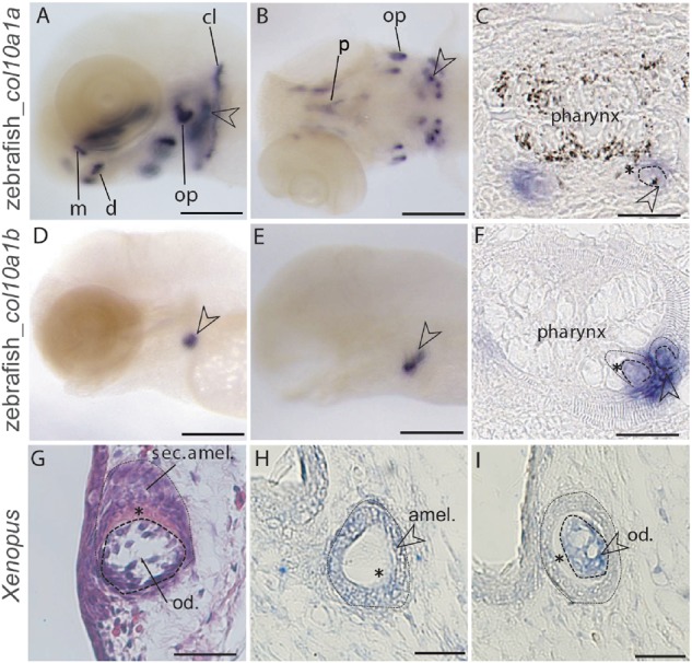 Fig. 4. Expression of zebrafish col10a1a and col10a1b and Xenopus Col10a1 during tooth development detected with in situ hybridization. (A, B) col10a1a expression in whole-mount zebrafish larvae at 4 and 6âdays post fertilization (dpf). (C) col10a1a expression in post in situ paraffin sections of zebrafish larvae at 5âdpf. (D, E) col10a1b expression in whole-mount zebrafish larvae at 4 and 6âdpf. (F) col10a1b expression in post in situ paraffin sections of zebrafish larvae at 4âdpf. (G) HE staining of a longitudinal section through a developing tooth bud of a Xenopus larva at stage NF57. (H, I) Col10a1 expression in Xenopus tooth bud on successive transversal sections. Open arrowheads point at developing pharyngeal teeth and asterisk marks the mineralizing matrix. Scale bars: 100âµm (A, B, D, E), 50âµm (C, F), 20âµm (G, H, I). Abbreviations: amel., ameloblasts; cl, cleithrum; d, dentary; m, maxilla; od., odontoblasts; op, opercle; p, parasphenoid; sec. amel., secretory ameloblasts.