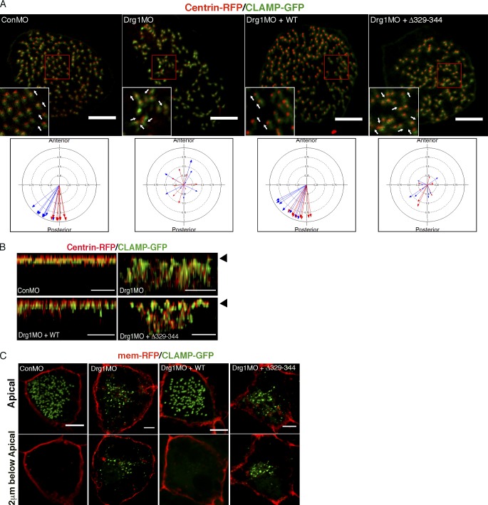 Figure 3. Drg1 is required for planar polarization and apical docking of basal bodies in MCCs. (A) Planar polarization defect in Drg1 morphants. CLAMP-GFP (rootlet marker) and centrin-RFP (basal body marker) were coinjected with the mixture of the indicated MOs and mRNAs. Areas enclosed by the red box are magnified in the insets, and arrows indicate the orientation of basal body/rootlets in MCCs. The circular plots depict polarity of basal body/rootlets in MCCs. Each arrow indicates the mean polar direction of basal body/rootlets in a single MCC. Arrow length depicts 1 minus circular variance of basal body/rootlet orientation around the mean. Different colored arrows represent data from different embryos. Scale bars, 5 µm. (B) Basal body docking defect at the apical regions of MCCs upon Drg1 knockdown. CLAMP-GFP and centrin-RFP mRNAs were coinjected with the cocktail of the indicated MOs and mRNAs. Serial z-stack confocal images were projected in the y-z plane. Arrowheads indicate the position of MCC apical surface. Scale bars, 3 µm. (C) Basal body docking defect at the MCC apical region upon Drg1 knockdown. CLAMP-GFP (green) and membrane-RFP (red) mRNAs were injected with the indicated morpholinos and mRNAs. Top panels indicate apical region of MCCs and bottom panels 2 µm below the apical region. Scale bars, 5 µm. |