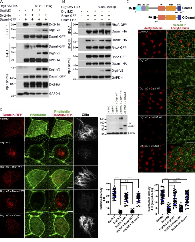 Figure 7. Drg1 modulation of Daam1 activity is critical for multiciliation. (A) Drg1 knockdown reduces the Dvl2âDaam1 interaction. The cocktail of the indicated mRNAs and MOs was injected into embryos, and co-IPs were conducted with embryos harvested at stage 20. MO-resistant Drg1-V5 expression rescues decreased the Dvl2âDaam1 interaction upon Drg1 knockdown. (B) Drg1 knockdown decreases the Daam1âRhoA interaction. The indicated mRNAs and morpholinos were coinjected into embryos, which were collected at stage 20 for co-IP analysis. (C) C-Daam1 expression rescues reduced acetylated tubulin staining upon Drg1 knockdown. The indicated mRNAs and MOs were injected to two ventral blastomeres at the four-cell stage. For C-Daam1 expression, 2.5 pg of HA-tagged C-Daam1 encoding plasmid DNAs were injected. The embryos fixed at stage 27 were used for immunostaining. Expression levels of Daam1-WT and C-Daam1 were tested by Western blot. Relative acetylated tubulin intensity is quantified (image n = 40 from 15 embryos for each condition). ****, P < 0.0001, one-way ANOVA. Scale bars, 50 µm. (D) C-Daam1 expression restores the formation of the apical actin meshwork that was decreased upon Drg1 knockdown. The indicated mRNAs and MOs were coinjected into two ventral blastomeres of four-cell-stage embryos and fixed at stage 27 for phalloidin and acetylated tubulin staining. ****, P < 0.0001, one-way ANOVA; n = 40. Scale bars, 5 µm. Error bars indicate ± SD. n.s., not significant. |