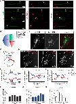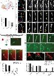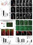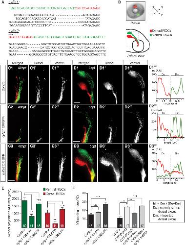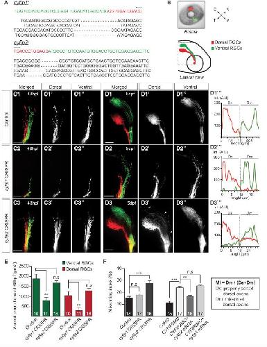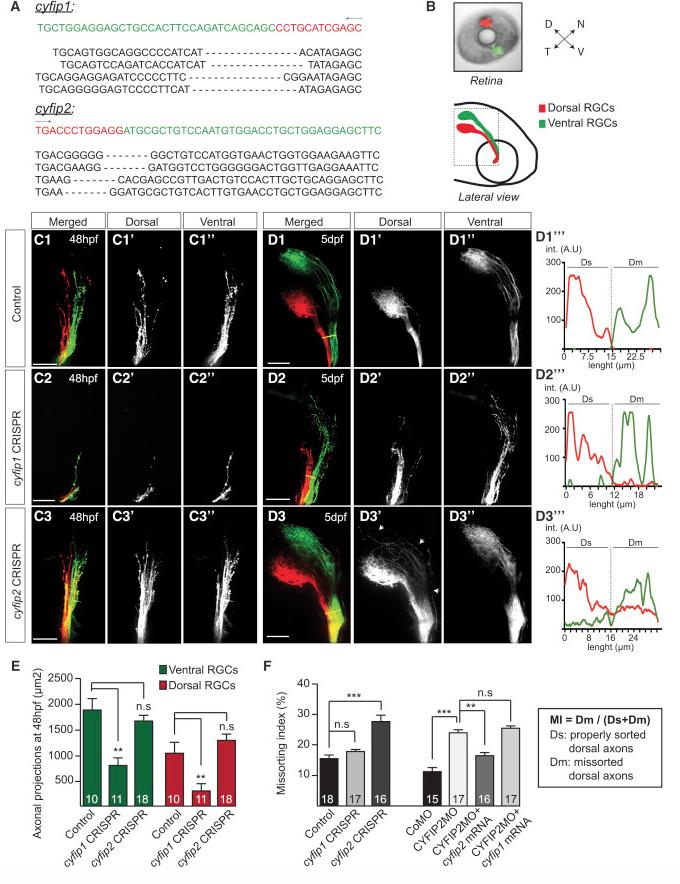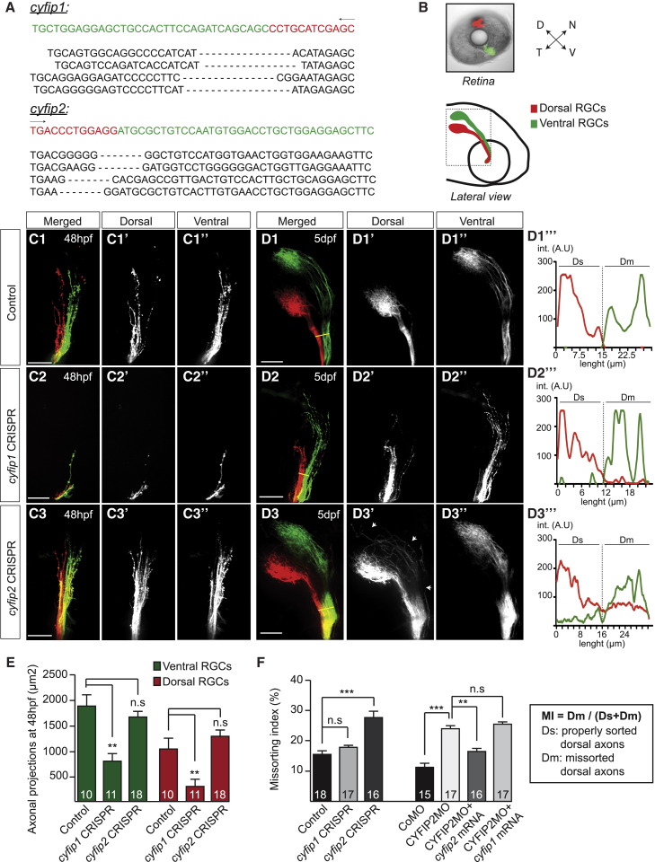 Figure 1. Differential Function of CYFIP1 and CYFIP2 during RGC Axonal Development(A) Sequence analysis of the whole zebrafish embryo injected with cas9 mRNA + cyfip1 or cyfip2 gRNAs. The target site is indicated on the sequence (green), followed by 4 examples of corresponding mutated regions.(B) DiI (red) and DiO (green) fluorescent dyes were injected in the zebrafish embryo retina at 5 dpf. The dashed line denotes the confocal imaging area of the optic tract (OT).(C1âD3â²â²â²) Dorsal (D) (C1â²âC3â², D1â²âD3â²) and Ventral (V) (C1â²â²âC3â²â², D1â²â²âD3â²â²) RGC projections were analyzed in control embryos (cas9 mRNA + gRNA control) (C1, D1), cyfip1 CRISPR-injected embryos (cas9 mRNA + gRNA cyfip1) (C2, D2), and cyfip2 CRISPR-injected embryos (cas9 mRNA + gRNA cyfip2) (C3, D3) at 48 hpf (C) and 5 dpf (D). Arrows in (D3â²) show missorted dorsal axons in the OT. Yellow lines in (D1)â(D3) indicate the reference line used for quantification of the missorting index (MI). Examples of DiI (dorsal) and DiO signals plotted along the reference line corresponding to sorted (D1â²â²â², D2â²â²â²) or misprojected (D3â²â²â²) RGC axons (int., intensity; A.U, Arbitrary Units).(E) Quantifications of D and V axonal projection area in the OT at 48 hpf.(F) The missorting index (MI) was quantified as the ratio of the intensity signal of the missorted D (Dm) axons to all the D axons (Dm+Ds). For gRNA cyfip1-injected embryos, only the embryos showing an axon growth phenotype were quantified (n = 18 embryos).Error bars represent SEM. ââp < 0.01, âââp < 0.001, n.s., non significant (Mann-Whitney test for E and F). The number of zebrafish analyzed is indicated on the bars. Scale bars: 50 μm (C1âD3). See also Figure S1. |