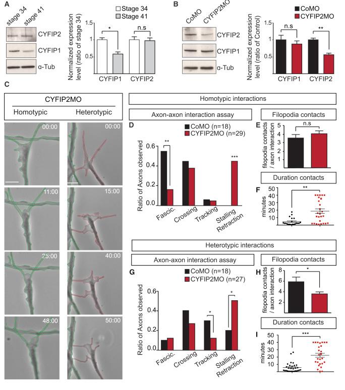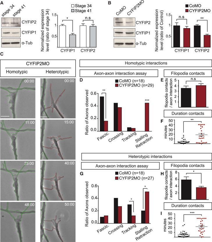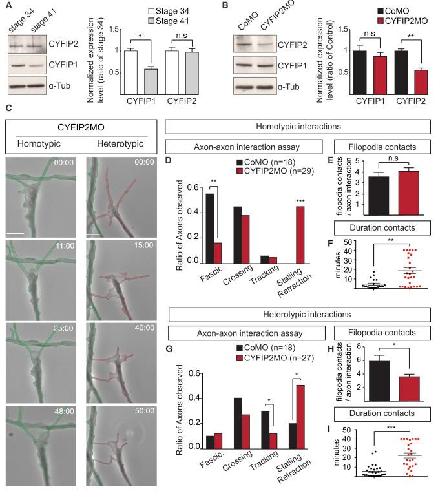 Figure 3. RGC Axon-Axon Interactions Require CYFIP2 Function(A) Representative western blots and quantification of CYFIP1 and CYFIP2 levels in Xenopus eye lysates at stages 34 and 41 (n = 3, normalized to α-Tubulin).(B) Representative western blots and quantification of CYFIP2 (n = 6, normalized to α-Tubulin) and CYFIP1 (n = 3, normalized to α-Tubulin) levels in CYFIP2MO- compared to CoMO-injected embryos at stage 34.(C) Examples of stalling growth cones (GCs) during homotypic and heterotypic responses after CYFIP2 depletion.(D) Quantification of the homotypic interaction responses after CYFIP2 knockdown.(E and F) Quantification of the number (E) and duration (F) of filopodia contacts during fasciculation and stalling events in CYFIP2MO (n = 7 GC, n = 27 filopodia) compared to CoMO (n = 6 GC, n = 20 filopodia) conditions for homotypic interactions.(G) Quantification of the heterotypic interaction responses after CYFIP2 knockdown.(H and I) Quantification of the number (H) and duration (I) of filopodia contacts during tracking and stalling events in CYFIP2MO (n = 8 GC, n = 26 filopodia) compared to CoMO (n = 5 GC, n = 29 filopodia) conditions for heterotypic interactions.(D and G) Numbers of events analyzed are indicated on the graph (n = 12 independent experiments).(EâI) Error bars represent SEM. âp < 0.05, ââp < 0.01, âââp < 0.001, n.s., non-significant (Mann-Whitney test for A, B, E, F, H and I) and (Fisherâs exact test for D and G). Time stamps are in the format of min:s. Scale bars: 5 μm (C). |