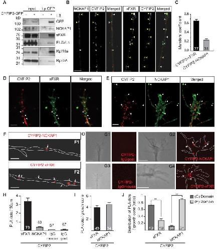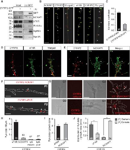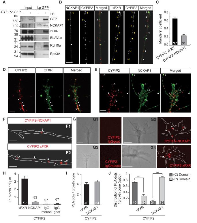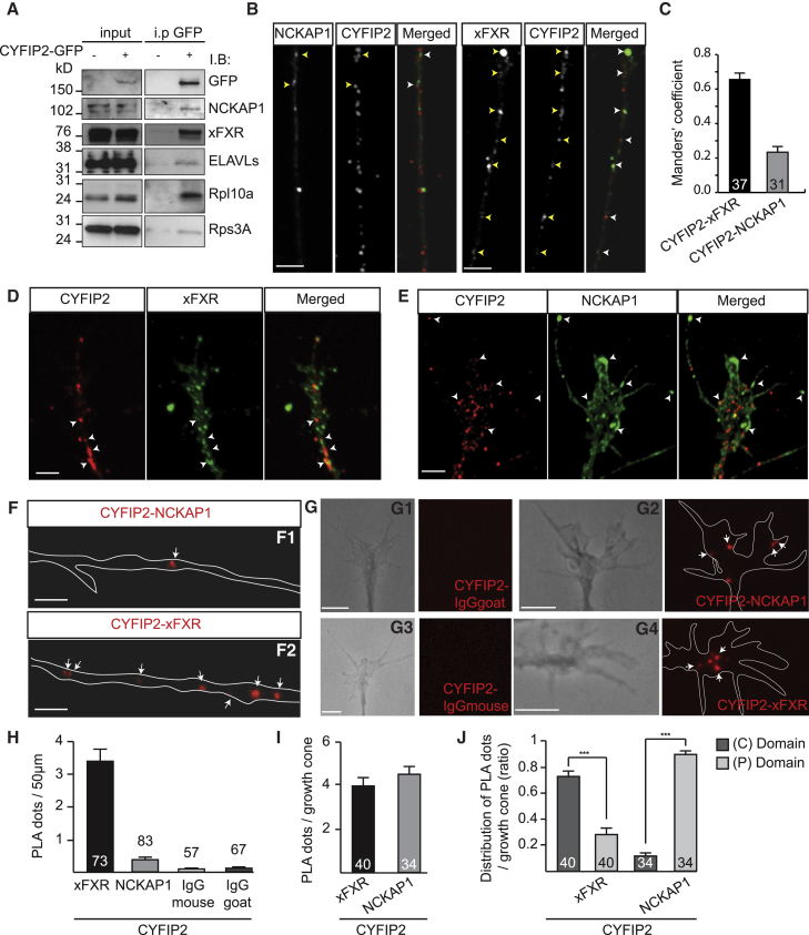 Figure 5. Subcellular Interactions of CYFIP2 with RNPs and WRC in RGC Axons(A) Immunoprecipitation with anti-GFP was performed on stage 32 Xenopus brains expressing CYFIP2-GFP, and immunoblotted with the indicated antibodies.(B) CYFIP2 and NCKAP1 immunostainings on stage 32 Xenopus retinal cultures.(C) Protein colocalization quantified by Mandersâ coefficient.(D and E) CYFIP2 with xFXR (D) or NCKAP1 (E) immunostainings on RGC growth cones.(F) Representative examples of the proximity ligation assay (PLA) obtained between CYFIP2 and NCKAP1, or CYFIP2 and xFXR, in the axon shaft.(G) Representative PLA examples obtained between CYFIP2 and NCKAP1 (G2) or control IgGgoat (G1), and between CYFIP2 and xFXR (G4) or control IgGmouse (G3) in the GC.(H) Quantification of the PLA signals in the axon shaft.(I) Quantification of the PLA signals in the GC.(J) Ratios of the PLA signals in the central (C) and peripheral (P) domain of the GC (Mann-Whitney test, âââp < 0.001).Error bars represent SEM. Number of axons analyzed is indicated on the graph. Scale bars: 5 μm. |