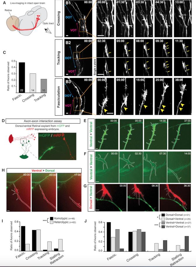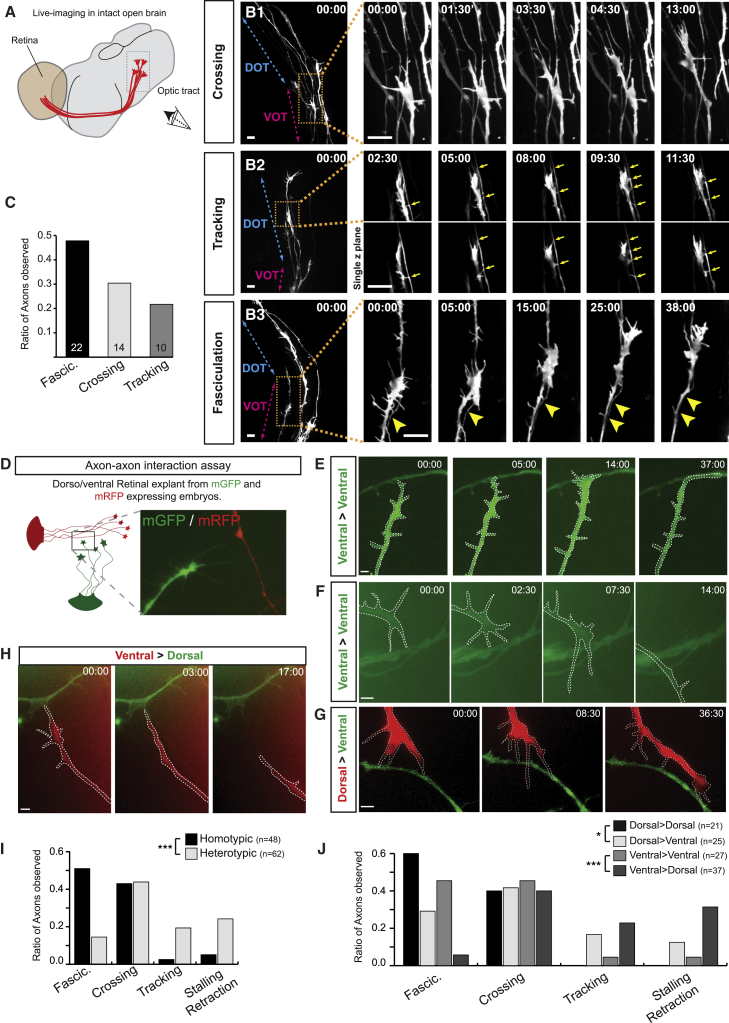 Figure 2. Dorsal and Ventral RGCs Exhibit Homo- and Heterotypic Axon-Axon Contact Recognition (A) Schematic of the retinotectal projection in Xenopus embryo. Time-lapse imaging of the OT was done from the indicated lateral view. (B1–B3) An example of each observed in vivo axon-axon response is showed first as an initial acquired large field, followed by a time-lapse sequence at high magnification. The position of the ventral (VOT) and dorsal (DOT) optic tract is indicated. (B1) RGC growth cone (GC) crossing the encounter axon shaft. (B2) RGC GC tracking along the encounter axon shaft by multiple filopodia contacts (yellow arrows). (B3) RGC GC growing on the encounter axon, leading to the fasciculation of the two axon shafts (yellow arrowheads). (C) Quantification of the axon-axon responses observed in the optic tract. (D) Assay used to monitor axon-axon interactions in vitro. (E and F) Examples of fasciculation (E) and crossing (F) events observed during homotypic interactions. (G and H) Examples of tracking (G) and retraction (H) events observed during heterotypic interactions. (I) Quantification of the global homotypic and heterotypic responses. (J) Quantification of the axon-axon responses relative to the RGC topographic origin. Time stamps are in the format of min:s. ∗p < 0.05, ∗∗∗p < 0.001 (chi-square test for I and J). Numbers of events analyzed are indicated on the graph (n = 21 independent experiments). Scale bars: 10 μm (B) and 5 μm (E–H). |