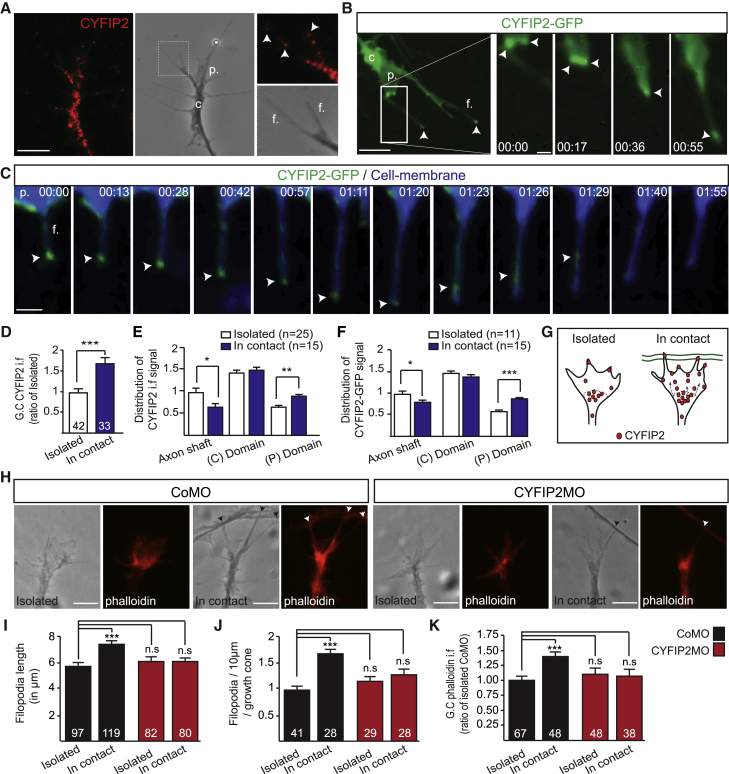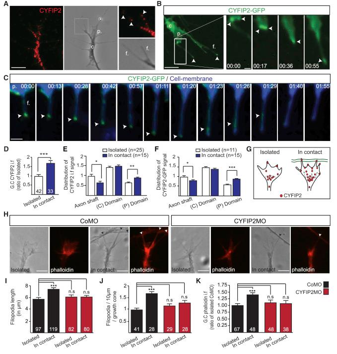 Figure 4. CYFIP2 Regulates Filopodial Dynamics and F-actin in the Growth Cone Peripheral Domain upon Axon-Axon Contact(A) CYFIP2 immunostaining on stage 32 Xenopus retinal growth cone (GC). Arrowheads indicate CYFIP2 in filopodia.(B) Time-lapse imaging of CYFIP2-GFP movements in RGC GC. Arrowheads indicate the accumulation of CYFIP2-GFP.(C) Time-lapse imaging of CYFIP2-GFP movements in an elongating GC filopodia labeled by a membrane marker (blue). Arrowheads indicate CYFIP2-GFP accumulation.(D) Quantification of CYFIP2 signal intensity in GC.(E) Distribution of CYFIP2 signal intensity along RGC axon shaft (last 10 μm) and GC central (C) and peripheral (P) domains.(F) Distribution of CYFIP2-GFP signal intensity along RGC axon shaft (last 10 μm) and GC central (C) and peripheral (P) domains.(G) Scheme illustrating the observed relocalization of CYFIP2 in the GC peripheral domain during axon-contact.(H) Phalloidin immunostaining on isolated or in contact stage 32 Xenopus retinal GCs from CoMO- and CYFIP2MO-injected embryos.(I and J) Quantifications of filopodia length (I) and number (J).(K) Quantification of phalloidin signal intensity in GC.The numbers of GC (D, J, and K) or filopodia (I) analyzed are indicated on the bars. Error bars represent SEM. âp < 0.05, ââp < 0.01, âââp < 0.001, n.s., non-significant (Mann-Whitney test for DâF and IâK). The GC central domain (c.), peripheral domain (p.), and filopodia (f.) are indicated (AâC). Time stamps are in the format of min:s. Scale bars: 5 μm (A, B left panel, and H); 1 μm (B right panels); 2 μm (H). See also Figure S2. |