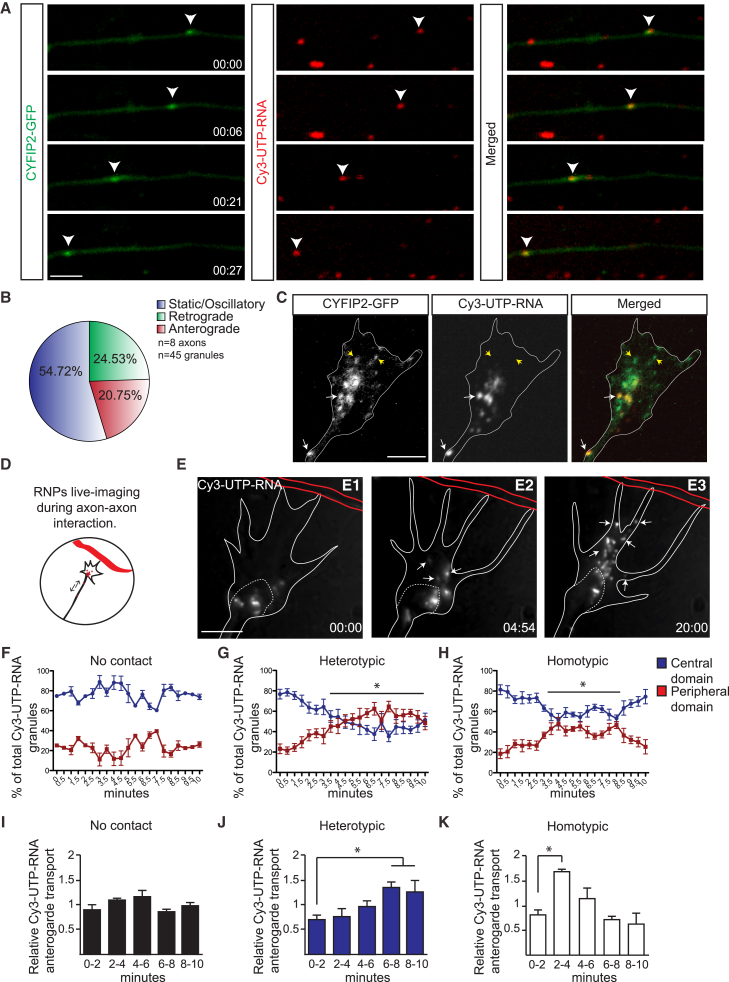 Figure 6. CYFIP2-RNP Recruitment in Growth Cones on Axon-Axon Contact(A) Time-lapse sequence showing the transport of CYFIP2-GFP in Cy3-UTP-RNA-granules in RGC axon shaft, highlighted by arrowheads.(B) Quantification of the CYFIP2-GFP containing RNPs motions in the RGC axon shaft.(C) Example of CYFIP2-GFP and Cy3-UTP-RNA granules signals in a RGC growth cone (GC).(D) Assay used to follow Cy3-UTP-RNA granules movements during axon-axon interactions.(E) Example of a time-lapse sequence showing the recruitment of Cy3-UTP-RNA granules in the peripheral domain of the GC in response to a heterotypic contact.(FâH) Quantifications of the relative Cy3-UTP-RNA granules distribution for each time point in isolated GCs (F) (n = 3 experiments), after heterotypic interactions (G) (n = 5 experiments) or homotypic interactions (H) (n = 5 experiments). T = 0 correspond to the cell-contact point.(IâK) Quantification of Cy3-UTP-RNA granules anterograde transport over time in isolated (I) (n = 3 experiments), after heterotypic interactions (J) (n = 4 experiments) or homotypic interactions (K) (n = 4 experiments), normalized to the average anterograde transport for each axon.Error bars represent SEM. âp < 0.05 (Mann-Whitney test for FâK). Time stamps are in the format of min:s. Scale bars: 3 μm (A) and 5 μm (C and E). |
