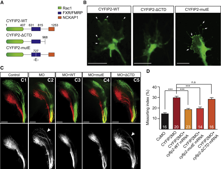 Figure 7. CYFIP2 Regulation of the WRC Mediates Axon Sorting in the Tract(A) Schematic illustrating CYFIP2âs regulatory domains and mutations.(B) Representative examples of CYFIP2WT-GFP (n = 9 GC), CYFIP2ÎCTD-GFP (n = 11 GC), and CYFIP2mutE-GFP (n = 13 GC) expression in Xenopus retinal cultures (n = 4 experiments). Arrows indicate CYFIP2-GFP accumulation in the growth cone peripheral domain and filopodia.(C1âC5) Lateral-view of whole-mount 5 dpf zebrafish embryos injected with DiI and DiO in the dorsal and ventral retina, respectively. Co-injection of CYFIP2MO + CYFIP2WT (C3) or CYFIP2mutE (C4), but not CYFIP2ÎCTD (C5), mRNAs rescue the pre-sorting defect observed in CYFIP2MO-injected embryos (C2) compared to CoMO-injected embryos (C1).(D) Quantification of the Missorting Index (Mann-Whitney test, âââp < 0.001, n.s., non-significant).Error bars represent SEM. The number of zebrafish analyzed is indicated on the bars. Scale bars: 5 μm (B) or 50 μm (C). See also Figures S3 and S4. |