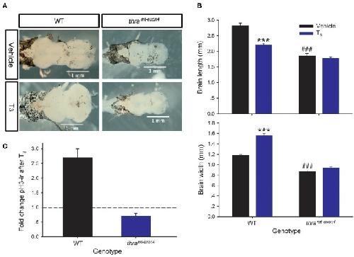 Figure 2. Thyroid hormone receptor α is required for T3-dependent morphological changes, and induction of cell proliferation in tadpolebrain. We treated wild type (WT) and thramtâexon4 premetamorphic (NF stage 54) tadpoles with T3 (5 nM) or vehicle added to the aquarium water for 42 h, then measured brain size and phosphorylated histone 3 immunoreactivity (pH3-ir) in the brain as described in the Materials and Methods. Bars are the mean ± SEM. (A) Exogenous T3 caused dramatic morphological changes in the brains of WT, but not thramtâexon4 tadpoles. Shown are dorsal images of fixed tadpole brains. (B) Exogenous T3 decreased length, and increased width of WT tadpolebrain, but had no effect in thramtâexon4 animals (***p < 0.0001, unpaired Student's t-test). In vehicle-treated tadpoles, the baseline brain length and width were both smaller in thramtâexon4 compared with WT (###p < 0.0001, unpaired Student's t-test). (C) Treatment with T3 strongly increased pH3-ir in WT (p < 0.0001, unpaired Student's t-test), but decreased it in thramtâexon4 tadpolebrain (p < 0.0001). Shown is the fold change in total brain pH3-ir nuclei in each genotype. The dashed line indicates fold change of 1.0 = no change.
