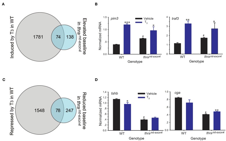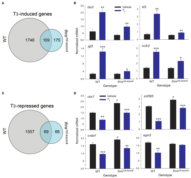 Figure 4. RNA sequencing shows that the majority of gene regulation responses to exogenous T3 are lost in thramtâexon4 tadpolebrain. We treated wild type (WT) and thramtâexon4 premetamorphic (NF stage 54) tadpoles with T3 (5 nM) added to the aquarium water for 16 h, then analyzed mRNA levels in brain (region of the preoptic area/thalamus/hypothalamus) by RNA-sequencing or RTqPCR using relative quantification. (A) Venn diagram representing the numbers of T3-induced genes determined by RNA-sequencing conducted on RNA isolated from tadpole brains treated with or without T3. (B) Validation of gene regulation for four T3-induced genes found within the overlap between the WT and thramtâexon4 gene sets (109 genes). (C) Venn diagram representing the numbers of T3-repressed genes determined by RNA-sequencing conducted on RNA isolated from tadpole brains treated with or without T3. (D) Validation of gene regulation for four T3-repressed genes found within the overlap between the WT and thramtâexon4 gene sets (69 genes). Bars represent the mean ± SEM (n = 4/genotype/treatment). For comparisons of vehicle with T3 treated: *p < 0.01, **p < 0.001, ***p < 0.0001, Student's unpaired t-test. For comparisons of baseline mRNA levels (vehicle treated) among the two genotypes: #p < 0.01, Student's unpaired t-test.