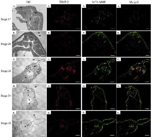 Fig. 3. Localization of TIMP-2 and MT1-MMP proteins during early X. laevis development. Immunohistochemistry was performed using Alexa Fluor 555-labeled anti-TIMP-2 (red) and Alexa Fluor 488-labeled anti MT1-MMP (green) antibodies on stage 17â38 embryos. Brightfield DIC images are shown on the left panels. Mono-colour images for TIMP-2 and MT1-MMP are presented individually. Colocalization of TIMP-2 and MT1-MMP (yellow) is indicated on the right panels. Dotted line in stage 28 merged image indicates overlapping signal within the middle of somites. Dashed line in stage 34 merged image indicates overlapping signal along the ventral neural tube. Scale barâ¯=â¯100 μm. Abbreviations: Eâ¯=â¯endoderm, Epâ¯=â¯epidermis, Dâ¯=â¯dorsal NT, DFâ¯=â¯dorsal fin, Nâ¯=â¯notochord, NCâ¯=â¯neural crest, NPâ¯=â¯neural plate, NTâ¯=â¯neural tube, Sâ¯=â¯somitic mesoderm, Vâ¯=â¯ventral NT.