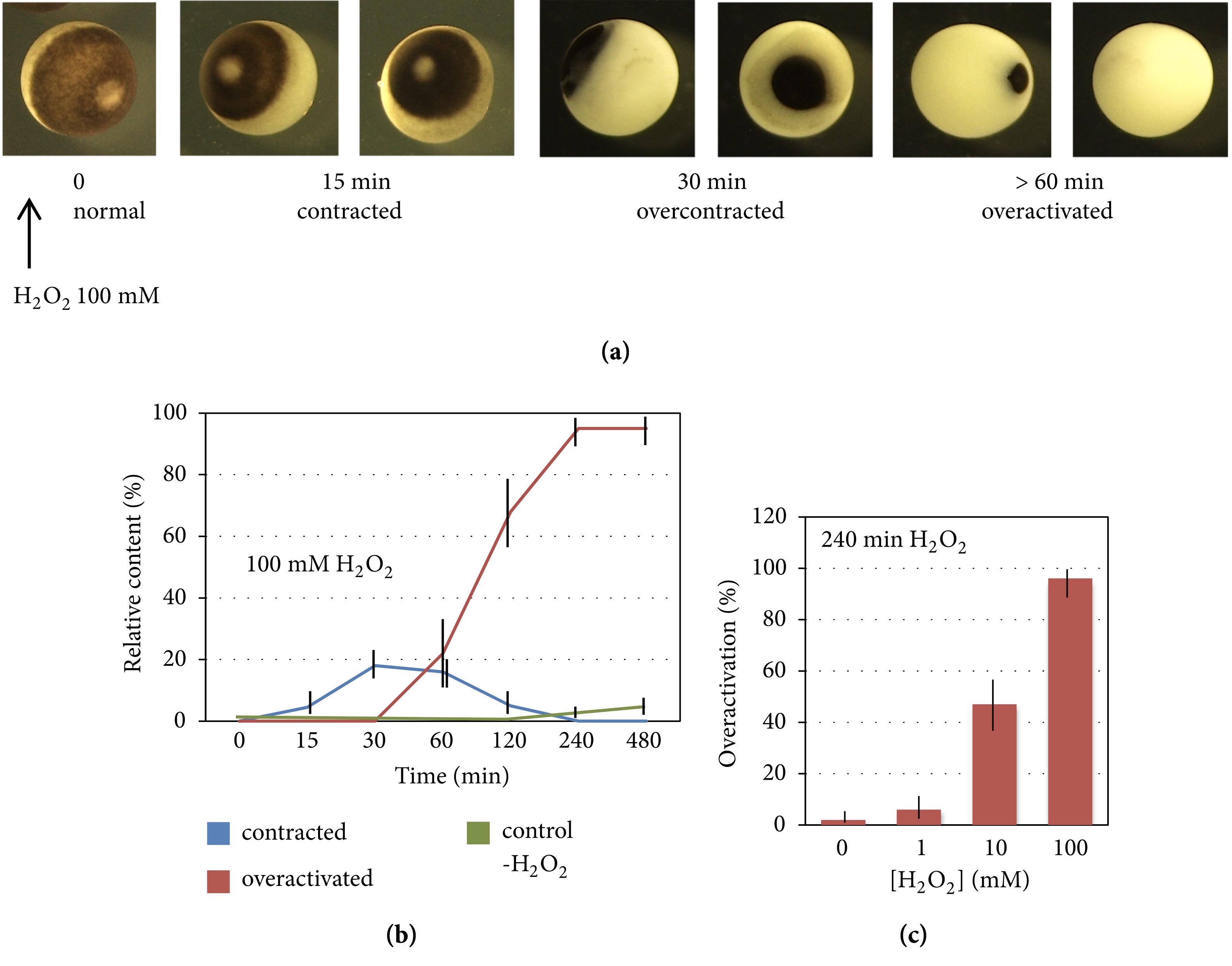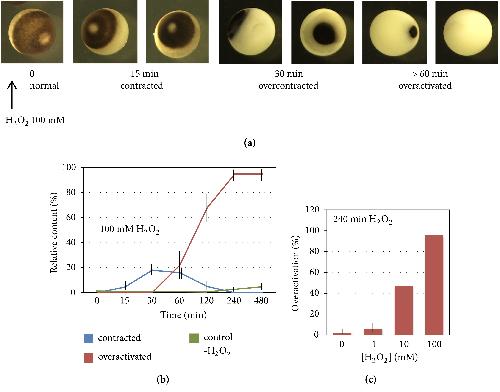 Figure 2. Time and dose dependencies of egg overactivation by hydrogen peroxide. Panel (a) shows dynamics of morphological changes in the eggs overactivated by 100 mM hydrogen peroxide. Panel (b) presents time course of egg cortical contraction and overactivation after addition of 100 mM hydrogen peroxide. The untreated control (-H202) in panel (b) refers to overactivated phenotype. Panel (c) shows dose dependency of egg overactivation. Overactivated phenotype in panel (c) was counted in 240 min after addition of peroxide.