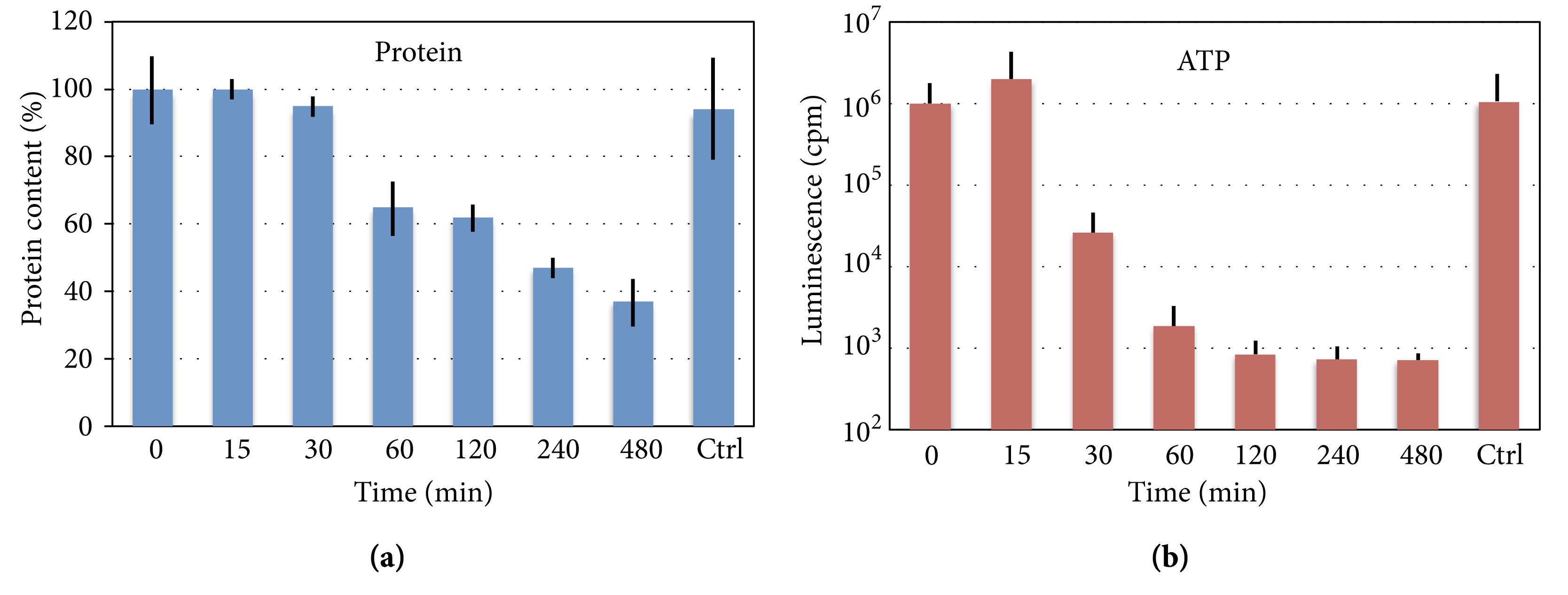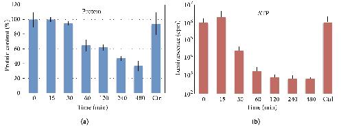 Figure 4. Protein and ATP contents in overactivated Xenopus eggs. The contents of soluble cytosolic protein and intracellular ATP in the eggs overactivated by addition of 100 mM hydrogen peroxide are shown in panels (a) and (b), respectively. Control (Ctrl) in the panels refers to the eggs incubated for 480 min in the absence of hydrogen peroxide.