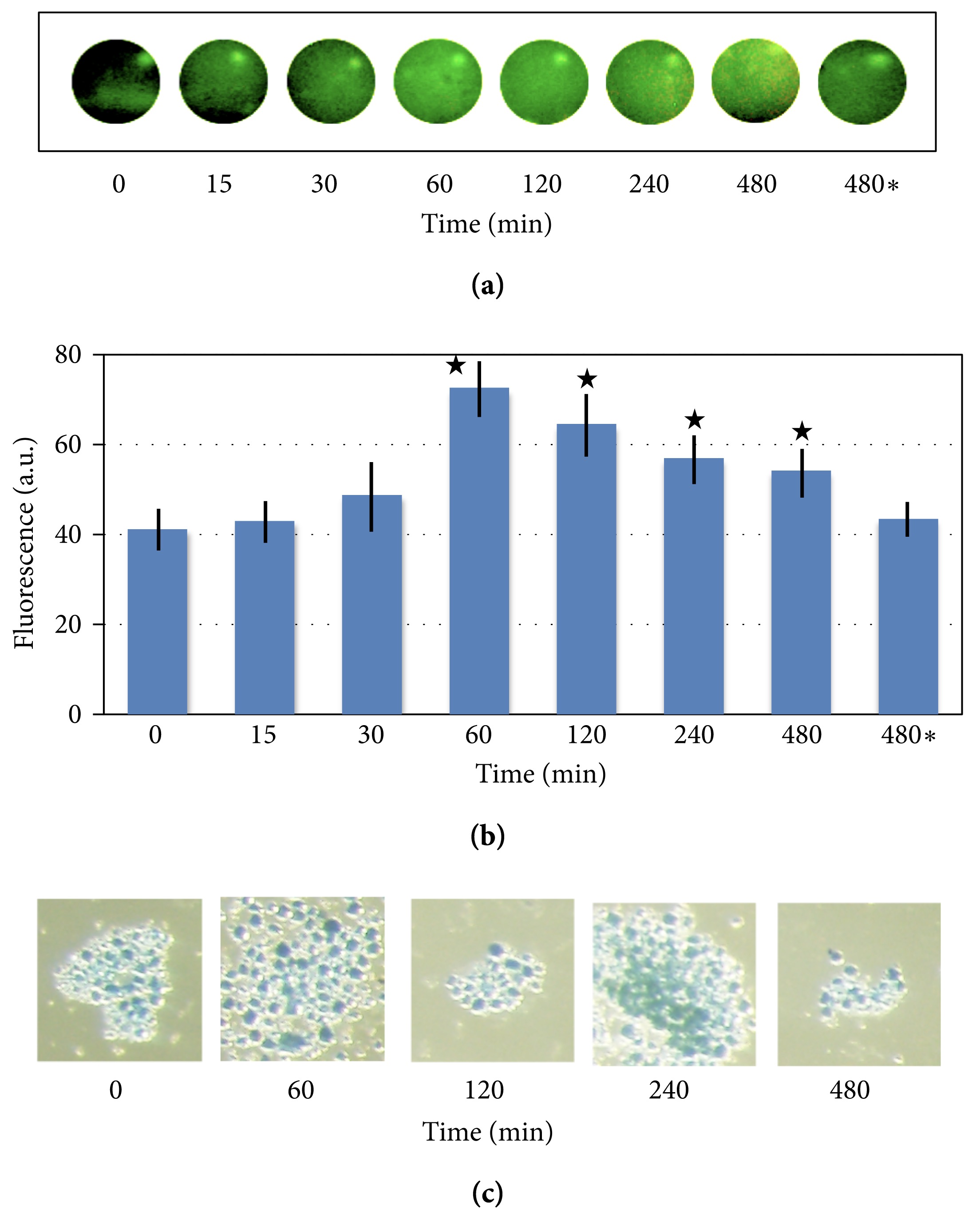 Figure 3. Oxidative stress-induced accumulation of lipofuscin in Xenopus eggs. Spot assay of lipofuscin autofluorescence in the insoluble particulate fractions of the peroxide-treated eggs and its quantification are presented in panels (a) and (b), respectively. The items labeled as 480â refer to control eggs incubated for 480 min in the absence of peroxide. Stars in panel (b) indicate statistical significance from the untreated control (p<0.05). Panel (c) shows SBB staining of the egg endosomal compartment. Hydrogen peroxide (f.c. 100 mM) was added to the eggs at 0 time.