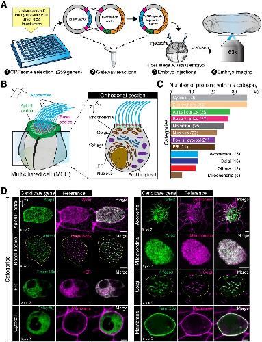 Fig. 1. High-content screening of protein localization in MCCs in vivo. (A) Schematics of the screening pipeline; see Materials and Methods for details. (B) Schematics of MCC subcellular structures, indicating the major distinct subcellular structures identified in our screen. (C) Summary of screening results. Out of 259 candidates, 198 showed detectable signal localized to distinct subcellular structures, as categorized on the histogram. (D) Representative localizations of screened Rfx2 targets. Left columns, expression patterns of selected genes; middle columns, expression patterns of reference genes. Afap1 localizes to the actin cortex (marked by LifeAct–RFP), Efhc2 to axonemes (marked by CAAX–RFP), Ablim1 to basal bodies (marked by Centrin2–BFP), Dap3 to mitochondria (marked by mito-RFP), Tmem38b to ER (marked by Cal–BFP-KDEL), Arfgap3 to the Golgi (marked by GalT–RFP), C10orf88 to cytosol, and Fam125b to the basolateral membrane (marked by CAAX–RFP). Numbers at the bottom-left corner indicate the z-plane position in reference to the apical domain (0 µm z). Scale bars: 5 μm. The yellow dotted line outlines the cell boundary of MCC. |