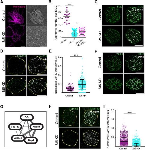 Fig. 4. St5 is required for ciliogenesis. (A) Perturbation of St5 disrupted ciliogenesis. Left panel, axonemes visualized by CAAXâRFP, magenta. Right panel, SEM of a control MCC and MCC upon St5 knockdown (KD). Scale bars: 10â µm. (B) The axoneme number per MCC was significantly reduced from 67.1±15.4 in controls to 14.0±8.2 in St5 KD (***P<0.001, MannâWhitney U-test; Control, n=14 cells; St5 KD, n=32 cells; N>5 embryos). The number of axonemes was increased by rescue expression of GFPâSt5 with an α-tubulin promoter to 18.6±8.5 (*P<0.05, MannâWhitney U-test; St5 KD with GFPâSt5, n=25 cells, N>5 embryos). Data represent mean±s.d. (C) St5 KD did not disrupt the recruitment of Ift20 (IftâGFP, green). Scale bars: 10â µm. (D) St5 KD increases the level of GFPâCp110 (green) at basal bodies (marked by Centrin2âRFP, white). Scale bars: 10â µm. (E) The normalized Cp110 intensities around basal bodies increased from 0.046±0.045 to 0.093±0.098. (***P<0.001, MannâWhitney U-test; Control, n=1430 intensities from eight cells; St5 KD, n=1413 from 10 cells; N>5 embryos). Data represent mean±s.d. (F) St5 is dispensable for Ttbk2 recruitment. GFPâTtbk2 showed ring shape structures in both control and St5 KD cells. (G) Network of St5-containing protein complex predicted by assembled map of human protein complexes (Drew et al., 2017). Line weights represent support vector machine confidence scores. (H) The level of Cep162âGFP (green) at basal bodies (marked by Centrin2âRFP, white) was decreased upon St5 KD. Scale bars: 10â µm. (I) The normalized Cep162 intensities around basal bodies decreased from 0.28±0.21 to 0.07±0.10. (***P<0.001, MannâWhitney U-test; Control, n=1734 intensities from 10 cells; St5 KD, n=1710 from 13 cells; N>5 embryos). Data represent mean±s.d. The yellow dotted lines in D and H outline the cell boundary of MCCs. |