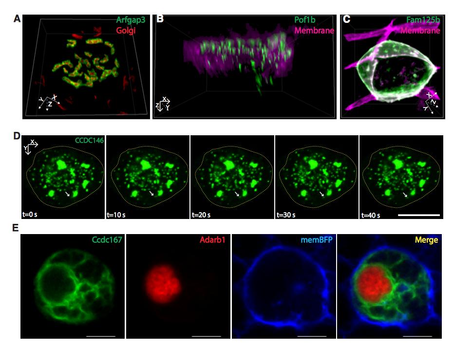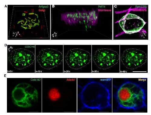 Figure S1. Subcellular localization of selected proteins from the screen in MCCs. (A) Arfgap3-GFP (green) localized to Golgi (Golgi marker, GalT-RFP, red), 3D view. (B) GFP-Pof1b(green) localized to the junction of MCC (membrane marker, CAAX-RFP, magenta), 3D view. (C) Fam125b-GFP (green) localized to basolateral membrane (CAAX-RFP, magenta), 3D view. (D) Image sequences of a MCC expressing CCDC146-GFP(green). CCDC146 localized to cytoplasmic foci of different sizes. White arrows indicate formation of a new focus. Yellow dotted line outlines the cell boundary of MCC. Scale bar, 10 μm. (E) An MCC from an embryo injected with Ccdc167GFP plasmid, Adarb1RFP plasmid and memBFP mRNA together. |