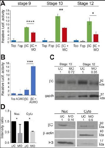 Fig. 3. agmo mediates canonical Wnt signaling. A) TOPflash assays reveal that Wnt driven luciferase production is reduced in agmo morphants throughout gastrulation (stages 9, 10, 12). B) Injection of agmo mRNA alone had no significant effect on luciferase activity, while co-injection of agmo mRNA and β-catenin mRNA increased Wnt activity significantly relative to injection of β-catenin alone. In A and B 10 embryos were pooled in each condition, and graphs represent the combined results of three biological and technical replicates. C) β-catenin protein levels are reduced in morphants at stage 10 and 12 as assayed by Western blot. D) Western blot analysis reveals that β-catenin protein levels are reduced in both the cytoplasmic (Cyto) and nuclear (Nuc) fractions of agmo morphants. The graph represents the combined result of four independent experiments. AGMO, AGMO mRNA; Top, TOPFlash reporter plasmid; Fop, FOPFlash negative control; BC, TOPFlash reporter plasmid + β-catenin mRNA; BC â+ âMO, TOPFlash reporter plasmid + β-catenin mRNA â+ âagmo morpholino; UC, uninjected control. All error bars represent â± âsd. *p â< â0.05, **p â< â0.01, ***p â< â0.001, ****p â< â0.0001 determined by students T-test.