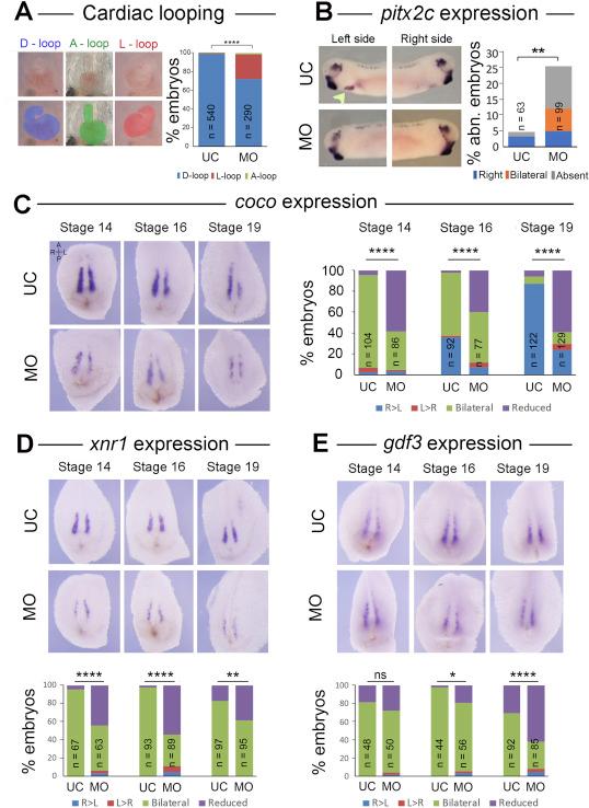 Fig. 1. agmo is required for L-R development. A) Depletion of Agmo disrupts cardiac looping. Lower images are pseudo-colored to highlight cardiac looping. B) Expression of pitx2c, which is normally only in left side mesoderm (upper row), is impaired in Agmo morphants (typically absent, lower row). abn.; abnormal C) coco expression is greatly reduced in the LRO from early in its development (before the initiation of flow, stage 14). LROs are dissected out and imaged ventrally. A; anterior, P; posterior, L; left, R; right. D) Expression of xnr1 and E) gdf3 is reduced in the left â rightorganizer of agmo morphants. Figure shows three developmental stages: stage 14 (pre-directional fluid flow) and stage 16 and 19. Graphs represent the combined results of six independent experiments for cardiac looping and xnr1, three repeats for pitx2, five repeats for coco, and 3 independent repeats for gdf3. UC; uninjected control, MO; morphant, ns; non-significant, *p â< â0.05, **p â< â0.01, ****p â< â0.0001 by Chi-square analysis.