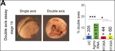 Fig. 4. Agmo mediates Wnt activity via its alkylglycerol monooxygenase activity. A) Injection of AGMO RNA alone can induce secondary axes, while injection of the catalytically dead H136A and H149A mutants cannot. Photos are representative examples of single (green dotted line) and AGMO induced double axes (red dotted lines) as seen at stage 19. Graph displays percentage of double axes in uninjected control embryos (UC), in embryos injected with wild type AGMO mRNA, and embryos injected with the H136A or H149A AGMO mutant mRNA. Data represents the combined outcome of three independent experiments. *p < 0.05, ***p < 0.001 by students T-test.