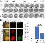 Fig. 2. Depletion of agmo impairs gastrulation. A) Time lapse images of gastrulation in uninjected control (UC, upper row), embryos injected with 1â¯ng MOATG (middle row) and embryos injected with 2â¯ng MOATG (lower row). UC embryos gastrulate normally, successfully closing the blastopore and forming the neural plate (green arrowheads). 1â¯ng MOATG embryos typically require several attempts to fully close the blastopore, and occasionally fail to complete gastrulation (blue arrowhead). 2â¯ng MOATG embryos never complete gastrulation despite multiple attempts (red arrowheads). B) The agmo morphant gastrulation phenotype can be rescued by co-injection of human AGMO mRNA (hRNA). Mini-ruby traces MOATG injection and GFP traces hRNA. Note that MOATG only embryos fail to gastrulate while co-injection of hRNA rescues the phenotype. Graph on right displays quantification of the human AGMO mRNA rescue. Data represent the combined result of three independent experiments. UC; uninjected control, MO; morphant. ****p â< â0.0001 by Chi-square analysis.