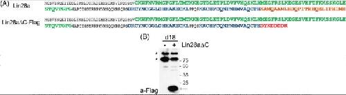 Overexpression of Lin28ÎC. A, Protein sequences of Lin28a and Lin28aÎCâflag highlighting the cold shock domain in green, the zincâknuckle domains in blue, the Câterminal domain in brown and the flag epitope in red. B, Western blot with the antiâflag epitope in tail samples of nontransgenic (â) and Lin28ÎC transgenic animals heatâshocked for 3âweeks (three times per week). The specific band of Lin28ÎCâflag is observed under 25âkDa. Nonspecific bands were detected above 75âkDa (asterisks) and were considered as loading control
