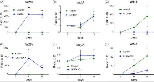 Overexpression of Lin28a or Lin28aÎC blocks the increase of albumin RNA in the liver. F1 nontransgenic siblings (control, green line) and transgenic animals (lin28a+, blue line) were heat shocked from day 0 to day 18 (three times per week for 3âweeks) starting at st.50. RNA was isolated at days 0, 9, and 18 and RTâqPCR was performed for lin28a (A), thrβa (B), and albâb (C). The same experimental scheme was used to overexpress Lin28aÎC (lin28aÎC+, blue line) and compared the gene expression to control animals (control, green line) for lin28a (D), thrβA (E), and albâb (F). Expression was normalized to eef1α and compared to day 0 (yâaxis; averageâ±âSEM, n = 3 independent experiments). *Pâ<â.05, twoâway ANOVA plus Sidak's multiple comparisons test