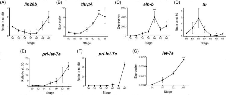 lin28b is downâregulated in the liver during metamorphosis. Liver samples were isolated at different NieuwkoopâFaber (NF) stages (xâaxis) and analyzed by RTâqPCR for lin28b (A), thrβA (B), albumin (albâb; C), transthyretin (ttr; D), priâlet7a (E), priâlet7c (F), and mature letâ7a (G; averageâ±âSEM, n = 3â4 independent experiments). For lin28b, ttr, priâletâ7a, and priâletâ7c expression was normalized to eef1α and compared to st.50 (yâaxis). *Pâ<â.05; **Pâ<â.01; tâtest against hypothetical value = 1 (no change compared to st.50). For thrβA and albâb expression was normalized to eef1α. *Pâ<â.05; **Pâ<â.01; ***Pâ<â.001, ANOVA with Dunnett's multiple comparisons tests to stage 50. For letâ7a, expression was normalized to 5S rRNA. *Pâ<â.05; ***Pâ<â.001; ANOVA with Dunnett's multiple comparisons tests to stage 50