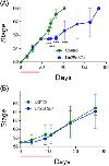 Câterminal domain of Lin28a is not required to delay metamorphosis. A, Metamorphosis progress (stages, yâaxis) of F1 nontransgenic siblings (control, green line) and transgenic animals (lin28a+) with HS from day 0 to day 18 (red bar) starting at st.50 (days, xâaxis). ***Pâ<â.001, unpaired tâtest for days 26, 28, 33, and 41. No significant differences were detected for days 11 and 19. B, Metamorphosis progress (stages, yâaxis) of F1 nontransgenic siblings (control, green line) and transgenic animals (lin28a+, blue line) with HS from day 0 to day 11 (red bar, 2âweeks) starting at st.57 (days, xâaxis). No significant differences were detected for days 9, 11, and 16