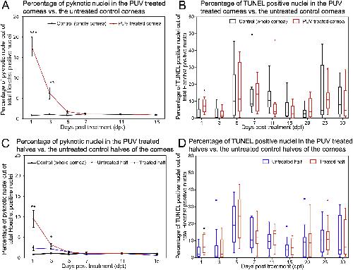 Fig. 6. Quantification of pyknotic nuclei and apoptotic cell death following PUV treatment on whole corneas and half corneas. (A, B) Counts of pyknotic nuclei and TUNEL positive nuclei, respectively, in the untreated controls (whole cornea) (black line) and the PUV treated whole corneas (red line). (C, D) Counts of pyknotic nuclei and TUNEL positive nuclei, respectively, in the untreated (control) halves (blue line) vs. the PUV treated halves of the corneas (red line) of the same corneas. Control (whole cornea) from (A) has been included in (C) for convenience of comparison (black line). The observations have been taken at the time points indicated on the X-axis (dpt). The pyknotic nuclei and TUNEL positive nuclei are represented as a percentage of the total Hoechst nuclei. (A, C) Error bars represent standard error of the mean. (B, D) Boxes represent lower and upper quartiles; whiskers and outliers represent Tukey range. Statistical analysis has been done for untreated control corneas (black) vs. PUV treated corneas (red) in (A, B), and for untreated control halves (blue) vs. the PUV treated halves (red) of the corneas in (C, D). Outliers have been included in calculating p-values in (B, D). N = 9 for all time points in (A). N = 9-13 for time points in (B). N = 10 for all time points in (C). N = 10-15 for time points in (D). *** = p ≤ 0.001; ** = p ≤ 0.01; * = p ≤ 0.05. (For interpretation of the references to color in this figure legend, the reader is referred to the Web version of this article.) |